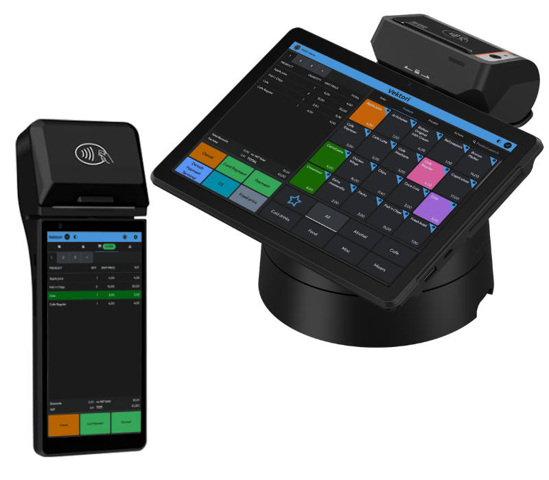 Yhdistä Vektori kassa ja Viva.com Terminal -sovellus yhteen 6” tai 10” Android-laitteeseen ja saat täysiverisen kassajärjestelmän ja maksupäätteen yhdellä laitteella – alkaen alle 30 € kuussa (laite + ohjelmisto). Ratkaisu sopii myös myymälöihin, ravintoloihin ja tapahtumamyyntiin.