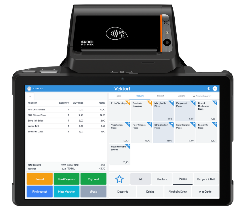 Jos haluat käyttää kassaa ja maksupäätettä eri laitteilla, Viva.com-maksupääte integroidaan suoraan Vektori kassaan. Maksusumma siirtyy kassalta päätteelle automaattisesti, ja kuitti tulee yhdestä järjestelmästä – ei tarvetta tuplasyötöille kassalla ja päätteellä.